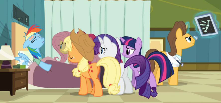不一会儿,苹果杰克便打破了这片沉默,对小蝶说道:“我很抱歉,甜心,但是云宝黛西她……住院了。”