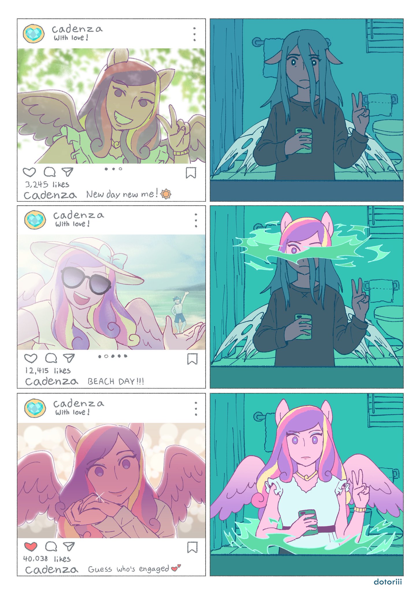 对……说她的心已经麻木了并不准确。她的心还能感受到一种情感。有一副画面吸引了她的注意力。翻过数百条千赞推文之后第一次,一匹可爱的名叫“卡丹萨”的雌马占据了屏幕的最中央。与其他浓妆艳抹的粉饰不同,她的每一条推文都散发着纯净无垢的清灵。她真诚的微笑,让观者忘记了一切烦恼。推文的背景从公园转换到海滩,又从海滩转换到餐馆。