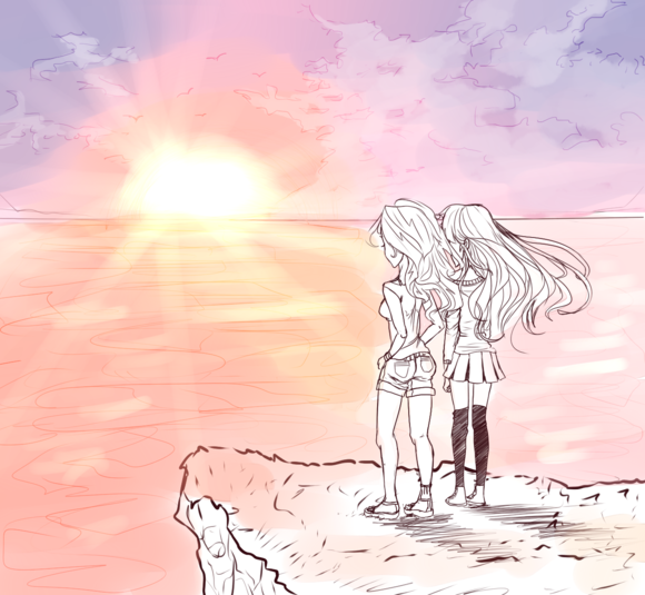 余晖金红的头发融化了,金碧的海滩融化了,暗红的夕阳融化了,她俩相拥的身影也融化了,一切都融化在了这日暮天红之中。