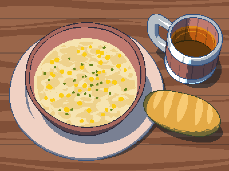(如宣传所说的,玉米杂烩羹汤是奶油味,而且味道浓郁。再加上烤箱里刚出的蓬松面包,再加上一大杯烈性朗姆酒,这是一顿暖心的美餐)
