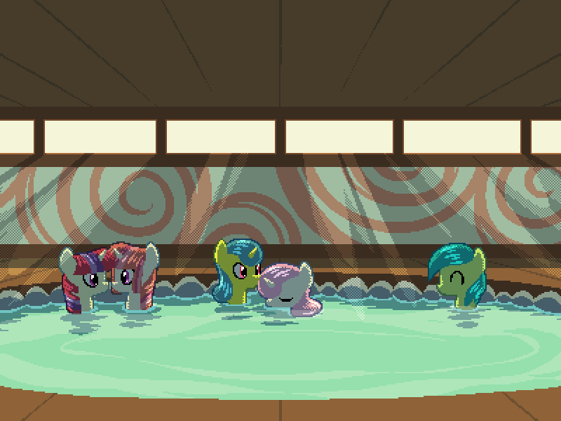 (在你的东西放好后,你们继续进入中间有一个大水池的房间,在那里你发现你的其他朋友已经在水里了。圆舞曲向他们喊道)