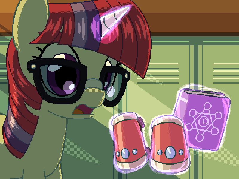(你把腿部护甲和典籍给了月亮舞,然后她开始用她的独角兽魔法来鉴定它们)