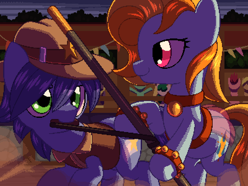 (信号一经发出,星星射手,一只戴着治安官帽的年轻雄驹,威吓似的把他的鞭子挥得噼啪作响。作为回应,雨舞者仅仅是简单地开始挥动短棍,并开始了她的表演)