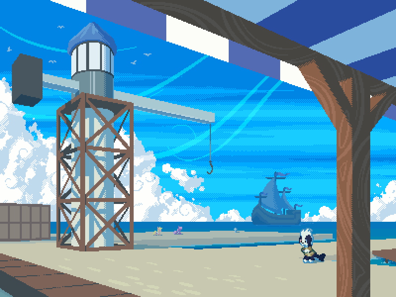 (沿着海岸,你看到大型起重机等待货轮的到来。港口的木码头两边固定着较小的船只,海员们在那里来来去去,并前往深蓝色的大海)