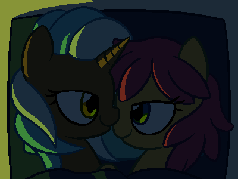 (你和水晶宝饰走进帐篷。当她摘下发夹放进箱子里时,你偷偷溜进了卧室。不久,这只独角兽也加入了,占据了剩下的大部分空间)