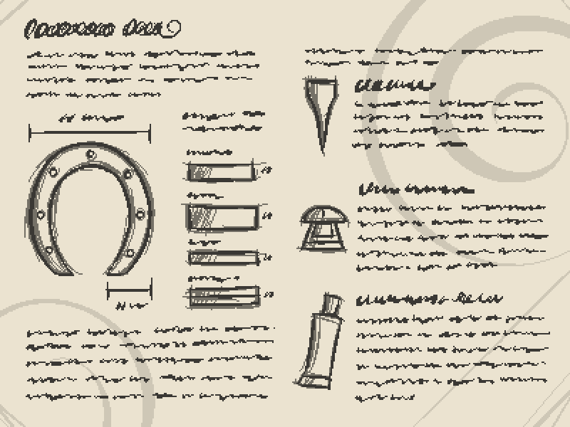 (浏览了几页之后,你偶然看到各种各样蹄铁设计的目录。说明如下:)