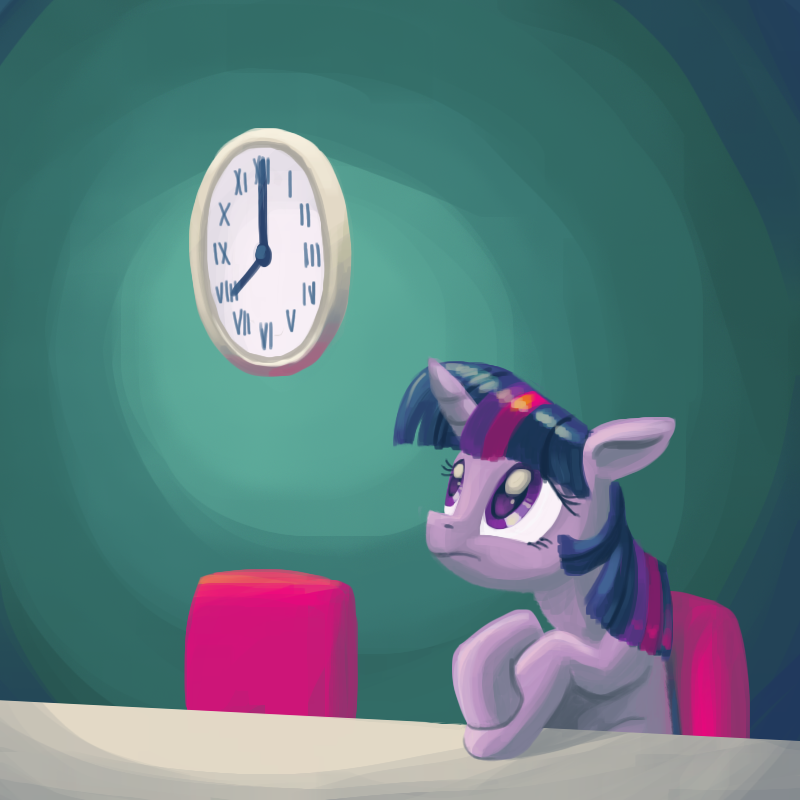 暮光有点不耐烦了,她开始用蹄子揉太阳穴,抚摸布艺沙发上的纹理。她长舒一口气,想要起身又停了下来。她又拿出手帐来确认时间,然后又看看表。她继续看窗外的风景,一个路过的幼驹向她打招呼,外面很暗,虽然看的不是很清楚,暮光还是向他挥蹄致意。暮光杯子里的水有些冷了,她只是抿了抿。我给她重新倒了一杯。