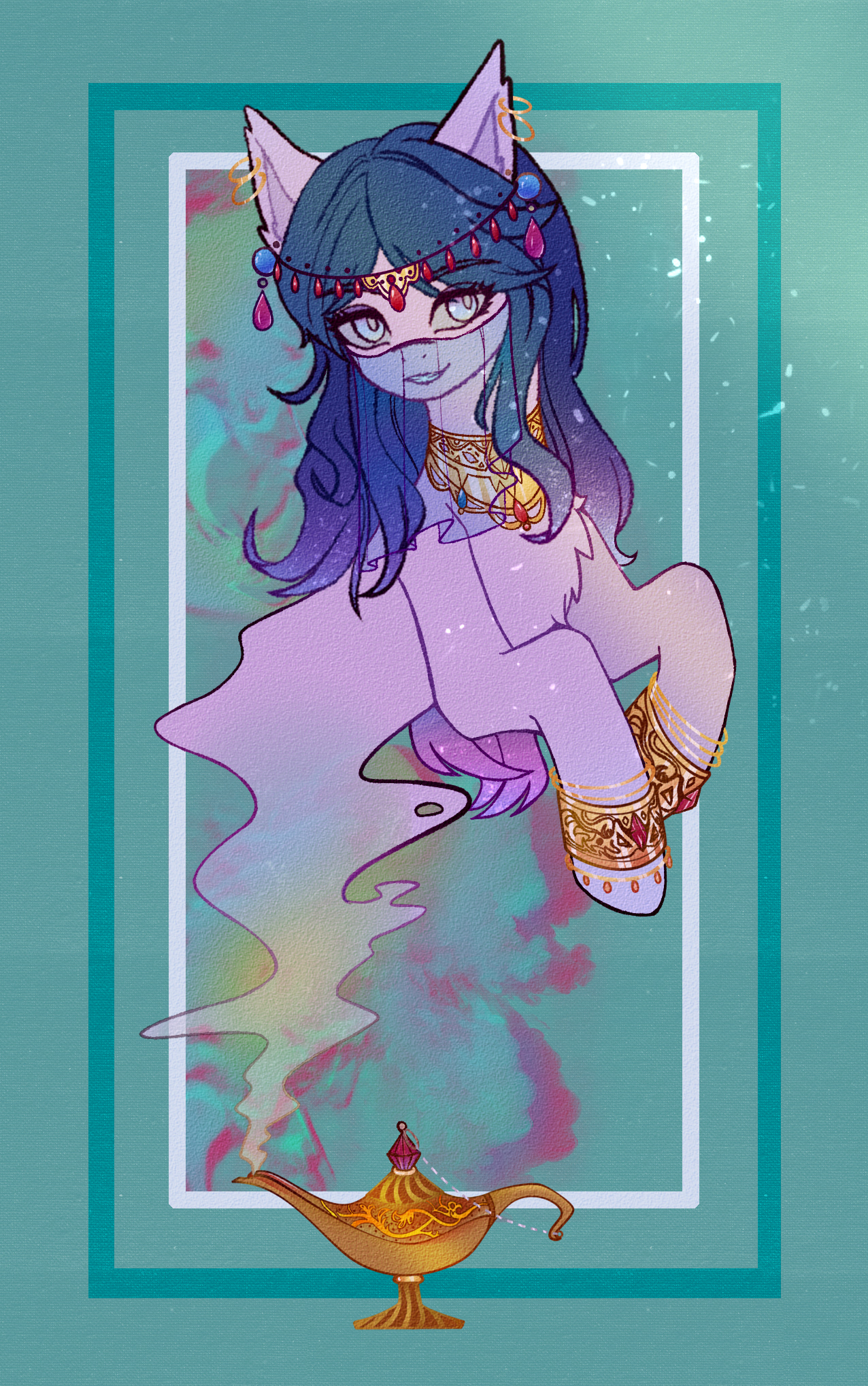 先前云宝黛西注意到的那只结晶塔内放置的陈旧油灯的灯嘴飘出一股烟雾,慢慢地汇聚成一匹小马的上半身的形象。那匹小马戴着舞女的面纱,身上缀满华丽的吊饰,看看那些结晶巨兽又看看下面的小马,玩世不恭又不失礼貌地笑了笑。