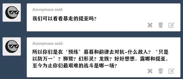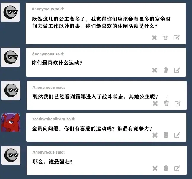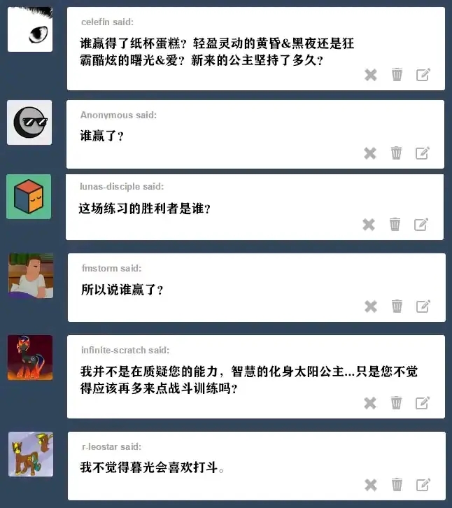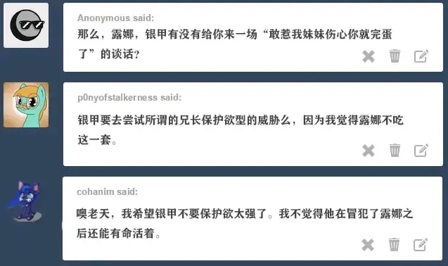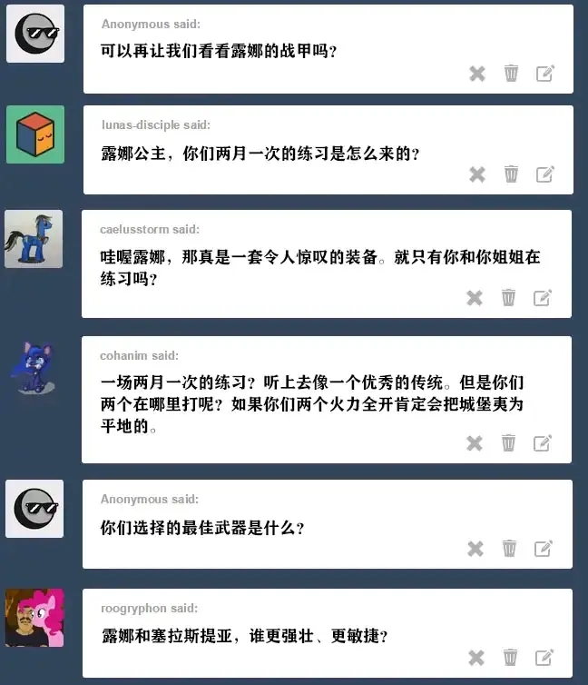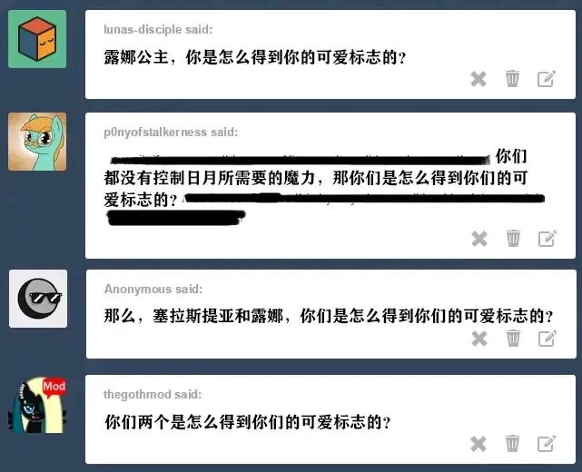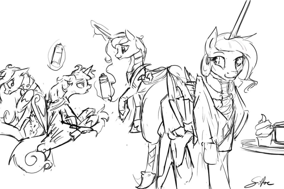 塞拉斯提亚:当我意识到我想给小马的生命中斯带来温暖和幸福时,我得到了我的可爱标志。当时我没有意识到“带来温暖”这部分内涵到底有多直白。我以为我会成为旅店老板之类的。 露娜:我们的父母也声称这是因为她性格开朗。当时我以为是因为她火爆的脾气。谢天谢地,她没往那个方向发展。