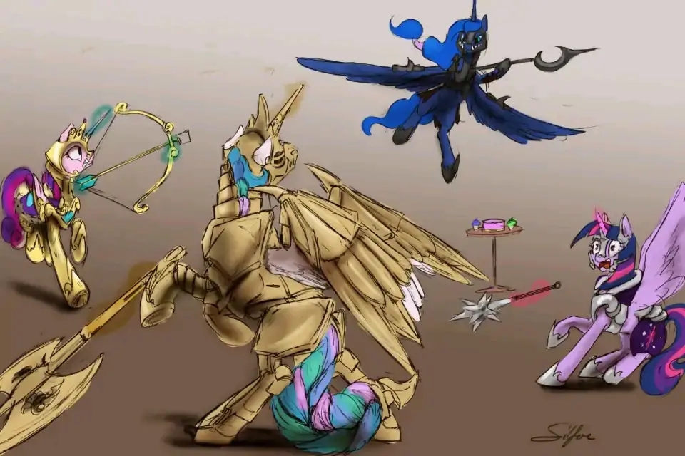 塞拉斯提亚:100年前和狮鹫的那场战争之后,再没谁有胆子敢直接威胁小马国了…不管什么原因。狮鹫已经成了强大的同盟国,只是以防万一别的种族打什么坏主意。暮光和韵律应该在必要的时候有能力保护她们的子民。