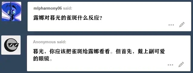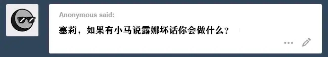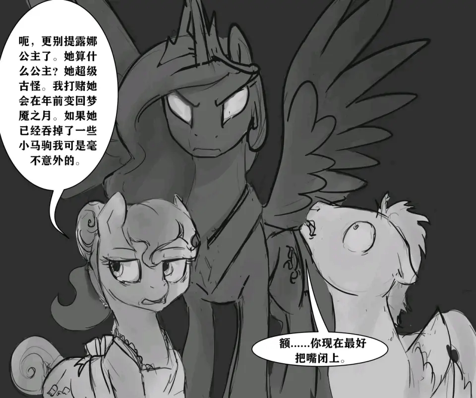 塞拉斯提亚: 做什么?当然没什么。言论自由受法律保护。不过要是敢在我面前这么干,他们至少会受到死亡凝视。有些小马只需要学聪明点……或者有点空间意识。