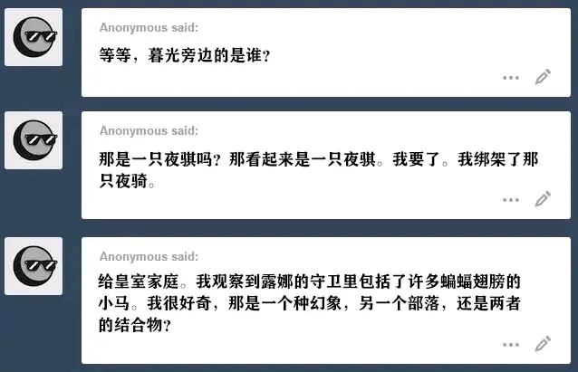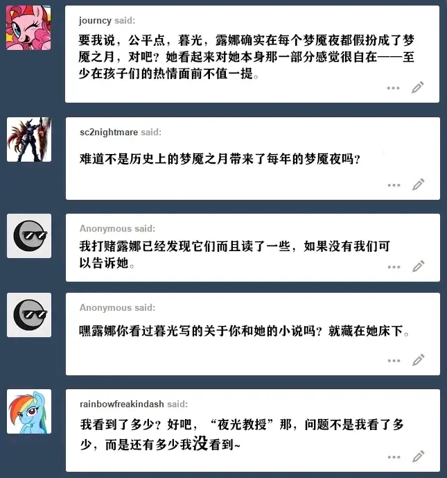 露娜:他们是一个很小的、与世隔绝的、夜间活动的部落,但他们极其忠诚和可敬……即使暮光声称我的无组织能力已经把他们逼到了精神错乱的边缘。我觉得她可能在投射什么。