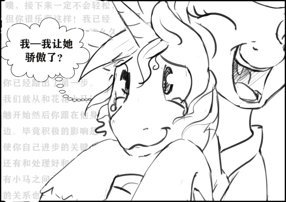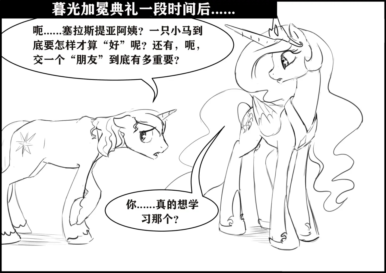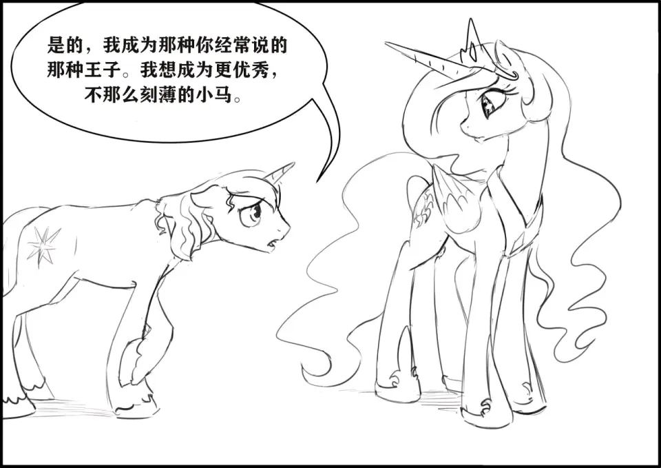 塞拉斯提亚:他终于准备好成为一匹更好的小马了!我希望他能摆脱他父亲的影响,但当然不能强迫他改变。只有当他选择改变的时候我才愿意帮忙……然后他准备好了!