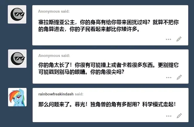 暮光:角……非常耐用。其中灌注的魔力角蛋白让它们同样有很强的弯曲度。