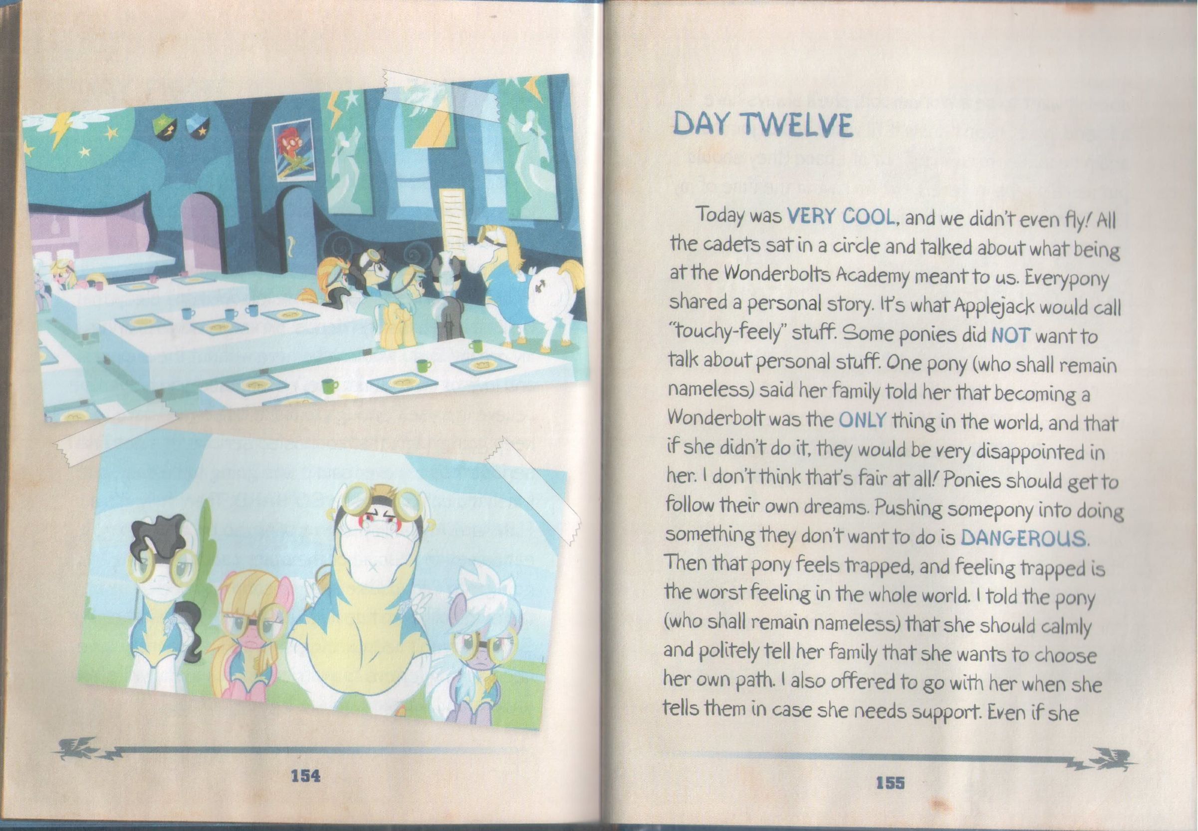 今天很酷,我们甚至连飞都没有飞!所有新兵坐成一圈,说一说在闪电飞马学院对我们意味着什么。每一匹马都分享了一个自己的故事。这就是苹果杰克会说成是“卿卿我我”的事情。一些小马并不想说自己的事情。一匹马(保留匿名)说,她的家里人告诉她,成为一名闪电飞马是世界上唯一的事情,如果她没有成为的话,家里人会对她非常失望。我觉得这终究是不公平的!小马们需要有机会追求自己的梦想。强迫一匹马做自己不喜欢做的事情是危险的。这样小马会陷入困境,而陷入困境在整个世界上是最糟糕的一种感觉。我告诉那匹马(保留匿名)她需要平静礼貌地告诉她的家人,她想要选择自己的道路。当她需要帮助时,我也会和她一起。即使她不想成为一名闪电飞马,她永远会是我的朋友。我不知道我还会再写日记,因为空间不够了(他们应该在这多放几页纸!),但是我很开心。这就是所有该说的了!