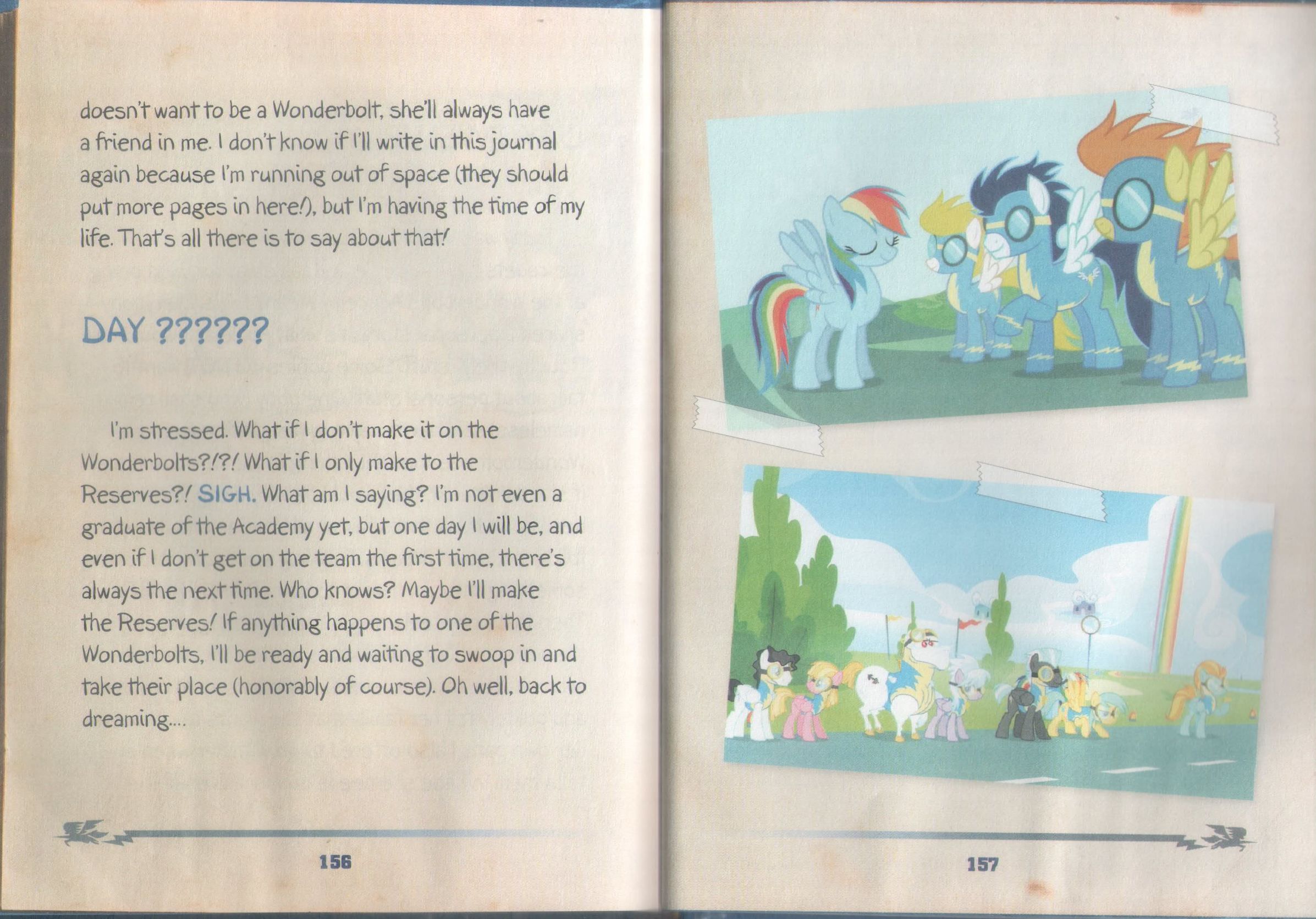 我很紧张。如果我没有成为闪电飞马会怎么样?!?!如果我只成为了预备队成员呢?!唉。我在说什么呢?我甚至还没毕业呢,但是总有一天会来的,即使我第一时间没有到队伍中去,总会有下次的。谁知道呢?有可能我会到预备队里!如果有什么事发生在一匹闪电飞马身上,我会准备好,等待乘虚而入,取代他的位置(当然是光荣的)好吧,还是接着去做梦吧……