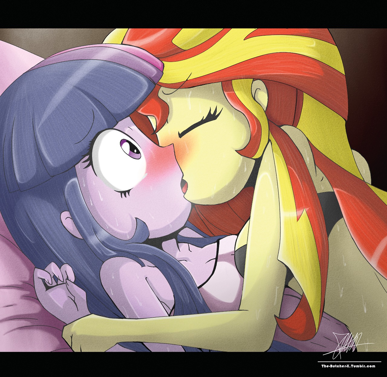 和往常一样,她们温柔地吻在了一起,然后分开,她们都轻轻地笑着。余晖小心翼翼地把暮光的小提琴放在一边,捧起她的脸,拇指抚过她的脸颊。一样温暖而柔软的东西压在了余晖的牙齿上,她分开它们,让暮光的舌头在自己的口中探索。余晖在阵阵喜悦中呻吟着,俏皮地靠向暮光。