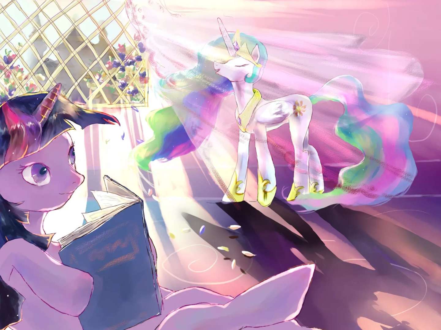 不知道她这样的性格跟做我的学生有没有关系。我不想给她压力,我也是这么做的,至少我这么认为;她或许从来不把我当真正的朋友,对于这个,我也不知是好是坏。如果她敲的是月舞的门,还会不敢进去吗?不过,也不能这样说……唉。至少,我还算是个好老师?毕竟她很乐意从我这里学东西,而且学的很快,我活了一千年,没有见过这么聪明又努力的小马!或许,只是因为她觉得做公主的学生必须这样?噢,你不要自作多情了,塞拉斯蒂亚。还记得当时暮光进来时,我就教了她一个魔法,让她能在几秒内把鬃毛吹干。