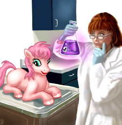 “转化室。三盎司纳米科技魔法原生质,同样被称为小马转化血清,或者‘药剂’;它由地球的纳米科技融合小马利亚的魔法辐射组成 — 现在把我变成小马吧。现在!加油,士兵!”这名女孩假装她在行军。