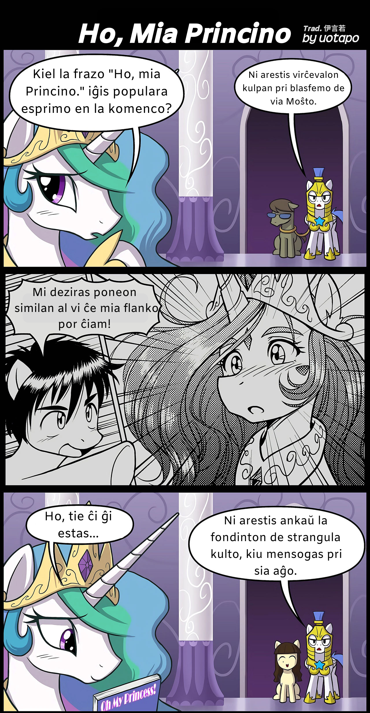 而P2捏他的正是《我的女神》中男主森里萤一向贝露丹蒂许愿的场景(希望像你这样的女神能永远陪伴在我身边!)。因为这部番剧上世纪末在日美动漫圈影响力很大,也一度使得“Oh, my godness”成为上一代二次元的流行语。而好巧不巧的是,小马们的常用习语中就有类似的表述,只不过中枪的是塞拉斯缇娅,uotapo便用这个巧合将两个世界的梗相互解释了。