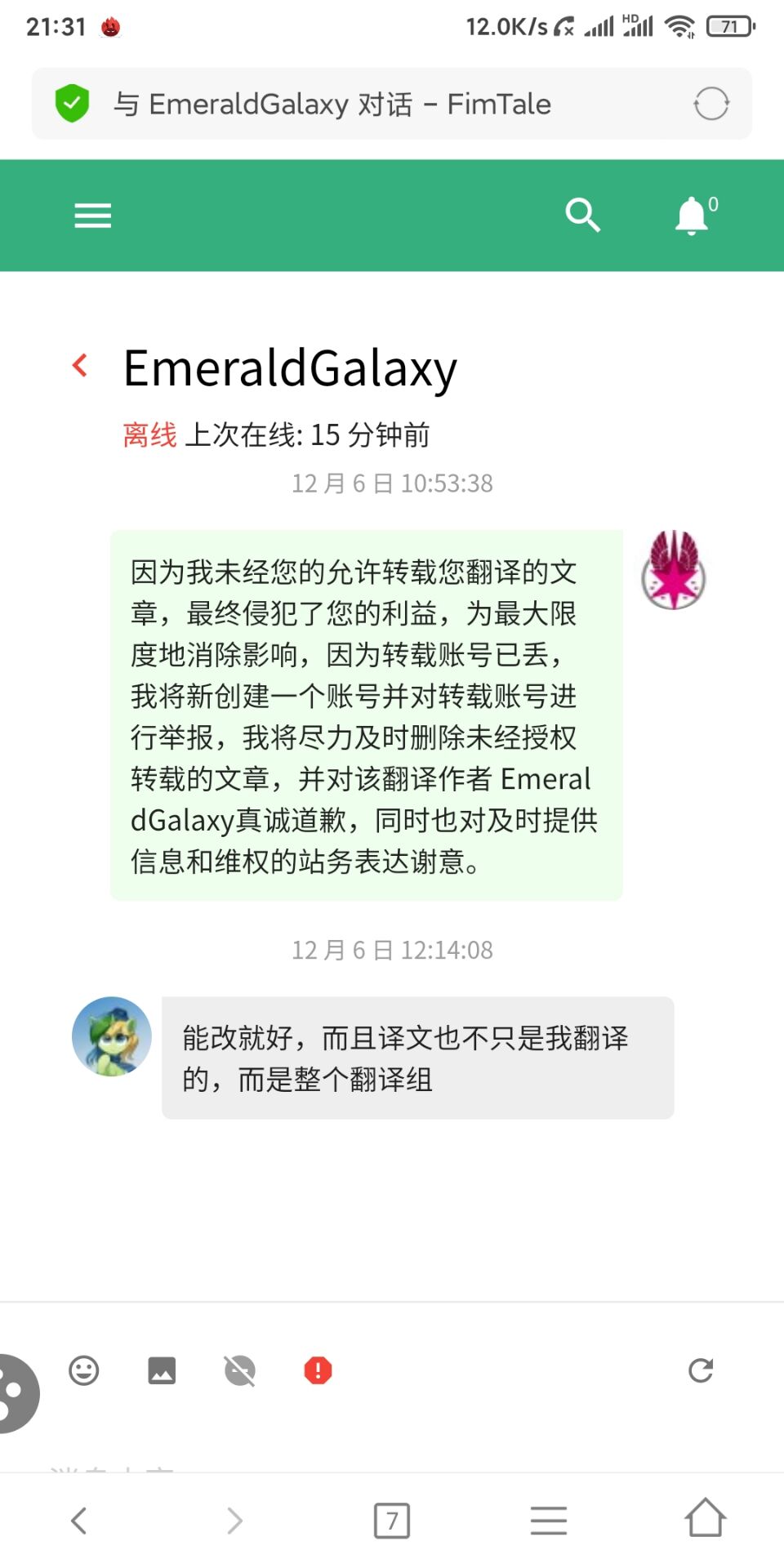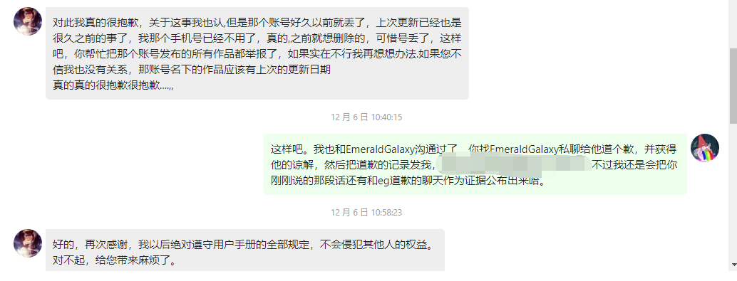 在发布针对用户sealevel(原名麒麟,现名partsilk,后统一称为麒麟)的封禁公告后,该用户第一时间找到我并主动承认了自己的错误。在我提出需要向《辐射小马国》翻译团队道歉后,他也进行了较为诚恳的道歉。具体聊天记录如下图所示(对话内容均已经过核实以保证真实无误):