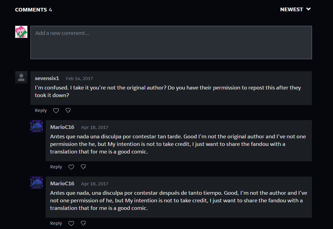 。(下图是搬运者搬运的第一张漫画下的评论区截图,来源:https://www.deviantart.com/marioc16/art/Sparkles-Experiments-log-01-580075407)