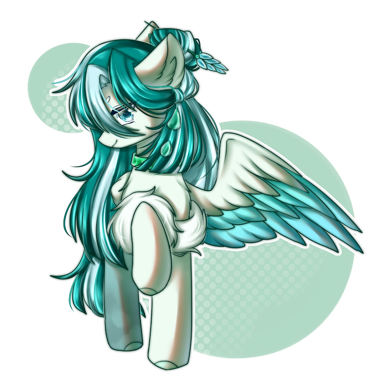 不过就在银翼和我惊慌大叫没一会,不知道是谁把我们抱住了,一直到几秒后,我才敢睁开眼睛——我们已经落地了!而救下我们的是一位浅葱色的天马,她眼睛还是黄、青色的异色瞳,翅膀上的翎羽也对应着眼睛的颜色。唔……总之非常的漂亮。