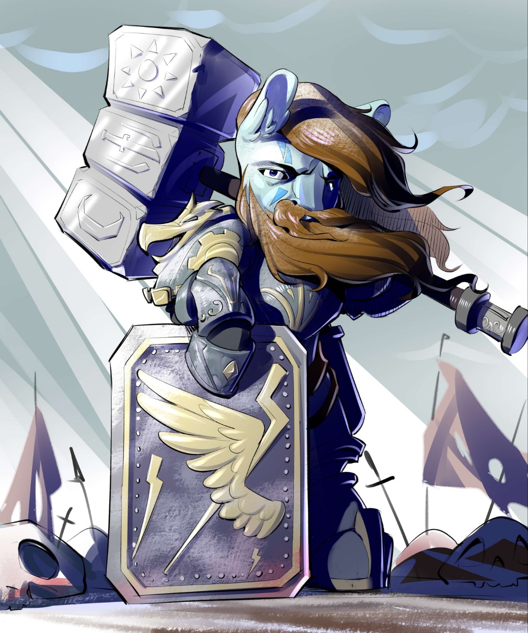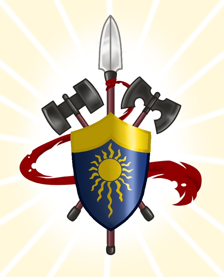 而主角的可爱标志是一把青铜色的盾牌中间有一颗金色的太阳(参考游戏战意里的塔盾和余晖烁烁的太阳标志),战斧斧刃上有着蓝色的条纹(请参考奎爷的利维坦之斧),一把朴实无华却不比战斧小的黑铁锻造大锤(就是普通的双头锻造锤外形)和一根金色的长矛(参考秦代长矛)。