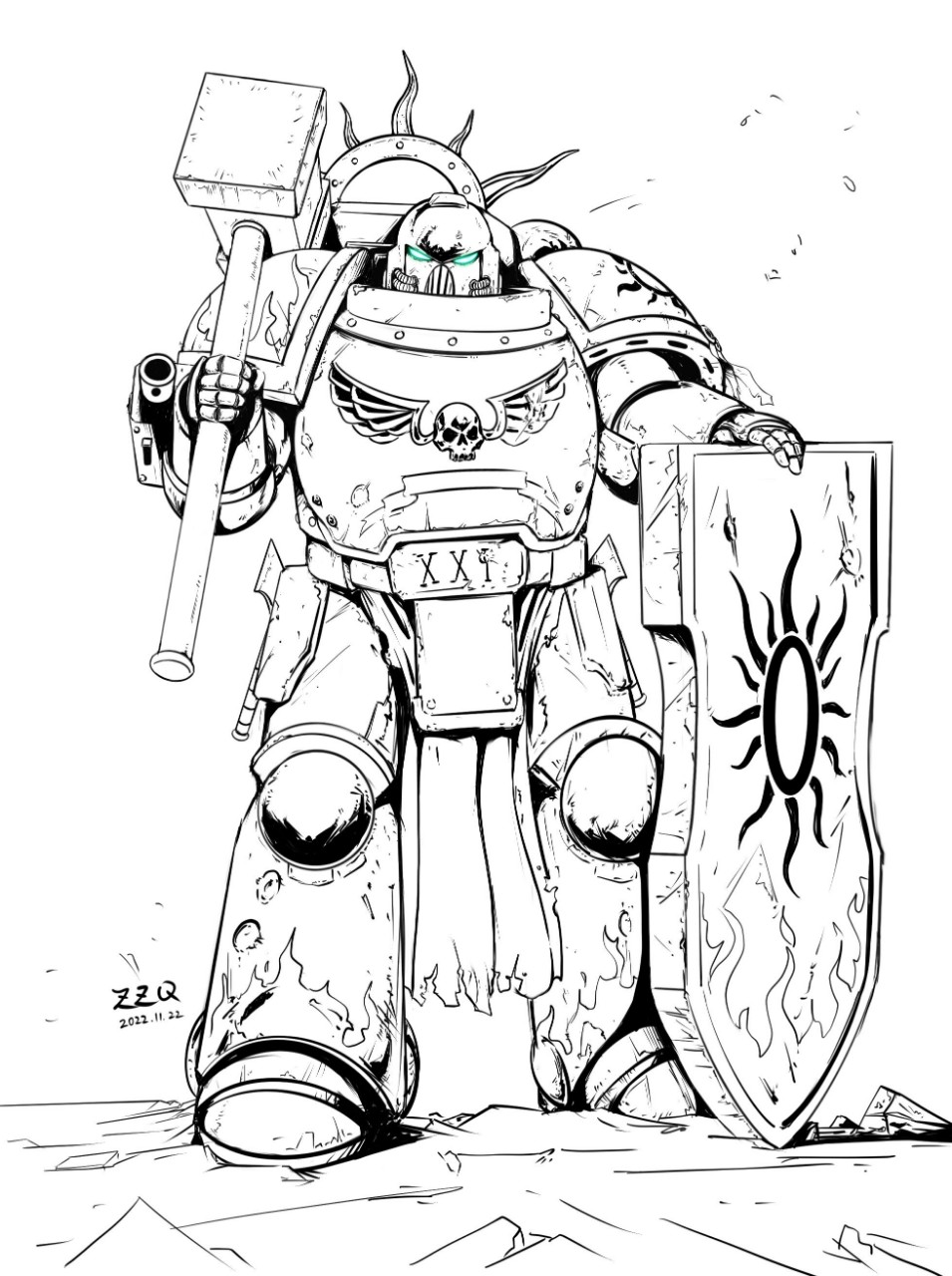 她是一套完全封闭的战斗装甲,由成型的金刚砂和塑钢板组成,包裹在合金陶钢层中。