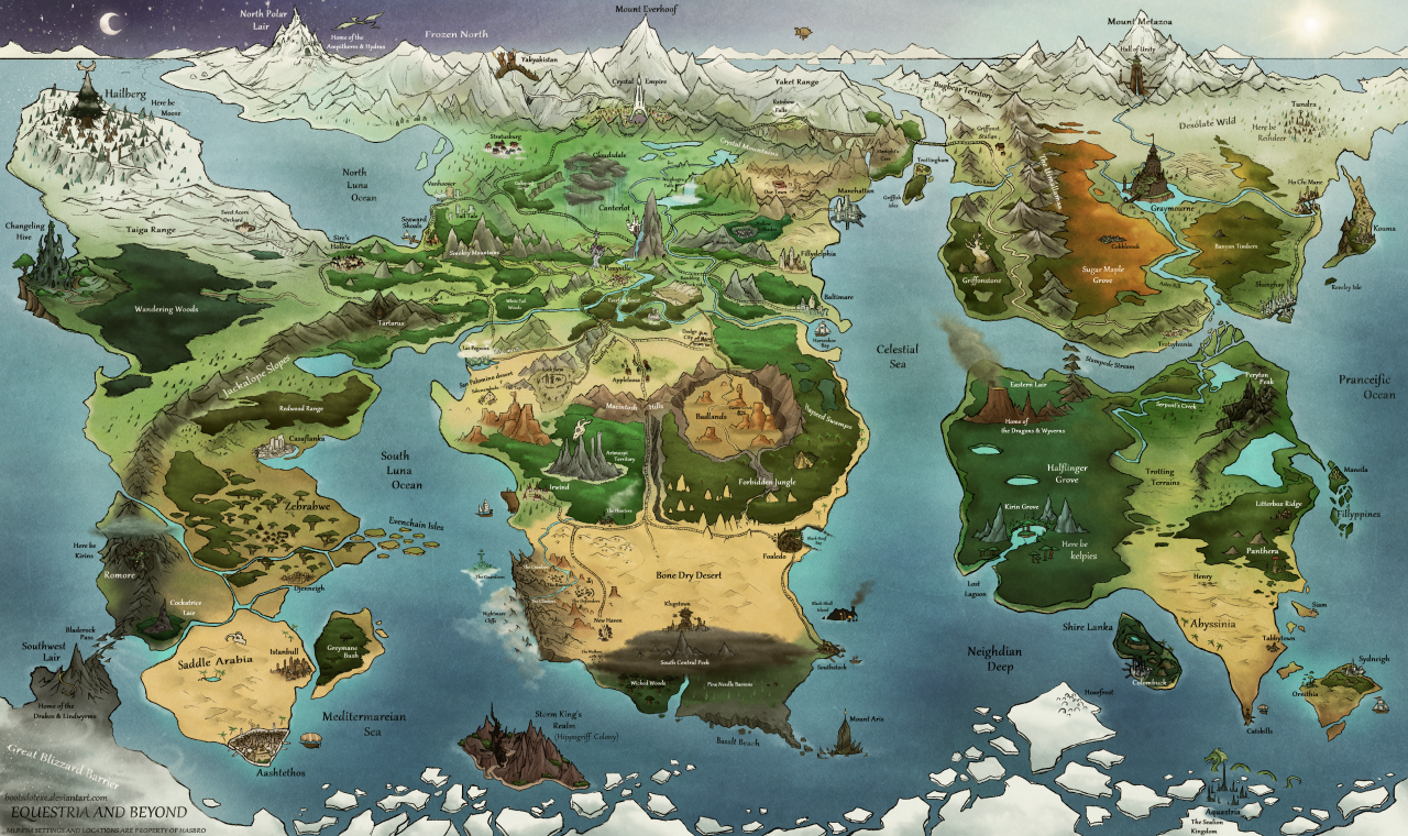 前注:对于本文世界地图的描述和本身的设定都参考自这张deviantart上面的bootsdotexe制作的“Equestria and beyond”,但也会有一些笔者自己的修改,例如巴奈马在地图上并不存在。