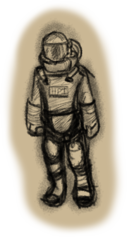 他们都身着防护服,就像……某种危险防护服,上面还有防暴护甲。他们背后画有蓝色的标志,是一束圆圈。他们肯定就是HPI了。他们身上都连接着电缆,是从那个箱子里伸出来的。不过就算有一大堆线缆遮挡着,我也能看到他们背后的氧气瓶。