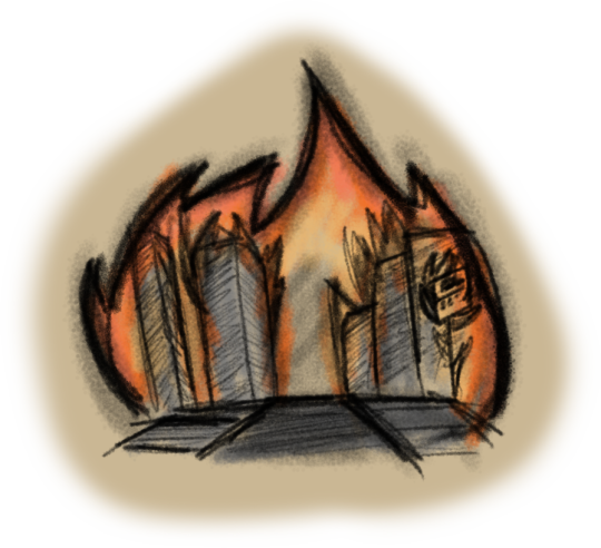 当时是凌晨,我刚躺下几个小时阴云遮天就来敲我的门,说她闻到了烟味。我根本没心思去穿衣服,只是和她一样裸奔到外面查看。她没说错。虽然太阳没还完全升起来,我还是能借助日光看见滚滚浓烟和闪耀着的橘红色火光。我不知道到底是什么东西在燃烧,我只知道我们时间不多了。