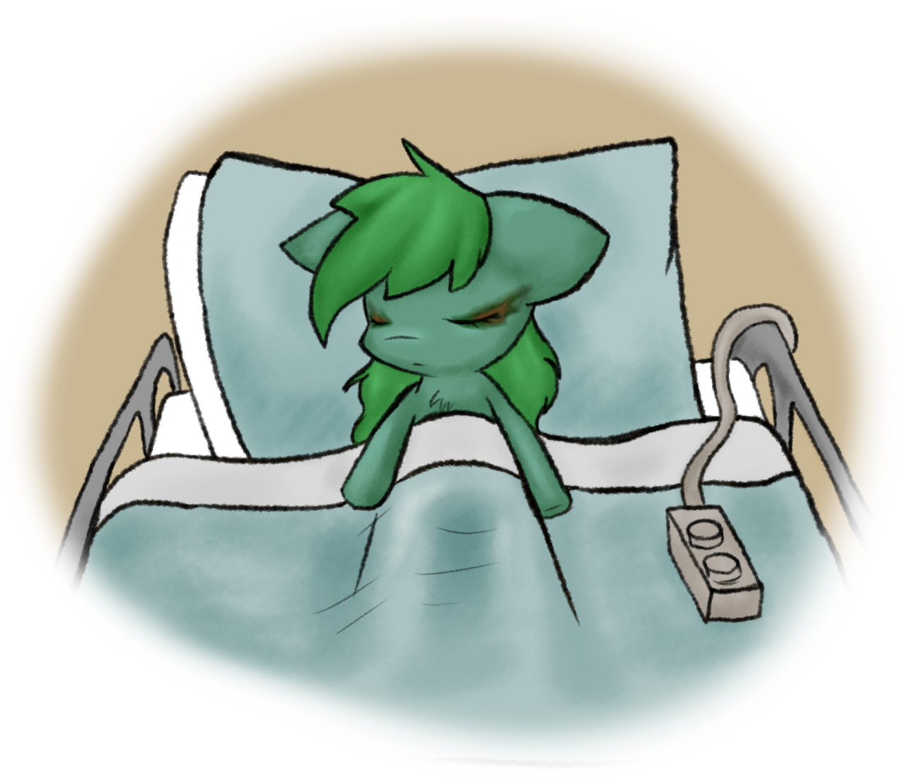 “很抱歉,我们还是得先关着他们,”阴天说。这时真视正准备走进一间铺有床铺的病房,准备和其他几只会飞的小马一起住在里面。“你不用进去。我知道你不会伤害自己的。”