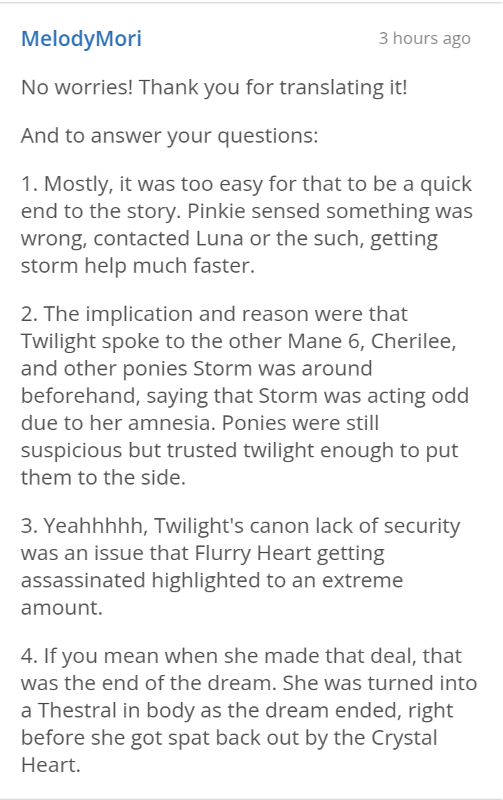 但你要是读完本文,仍觉得意犹未尽的话,我也推荐你关注续作——一只被露娜公主收养的小小夜骐是如何重新回到生活正轨的故事。MelodyMori的生肉文都蛮好啃的
