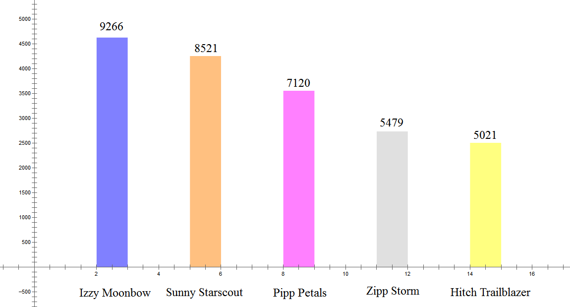 答:Izzy Moonbow: 7张,Sunny Starscout: 3张,Pipp Petals: 3张,Zipp Storm: 2张,Hitch Trailblazer: 0张