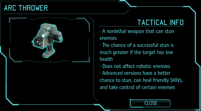电弧枪:一种非致命的副武器,设计用来使用高压电流让外星人失能从而可以捕获。