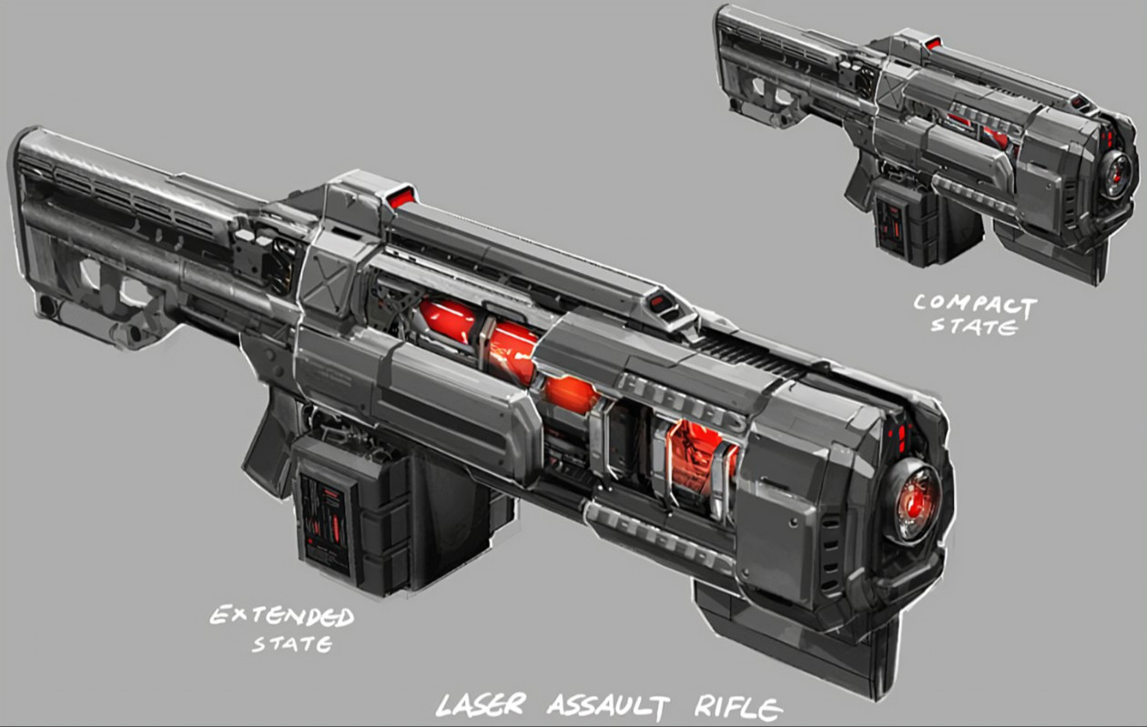 马特听到解释后抬起了一边眉毛,然后看着那两把步枪。两把枪都侧放着,弹匣放在旁边。激光步枪是一个四四方方的东西,有收起的枪托,枪管上方和下方似乎都有用于冷却的表面。一个黑色的握把就安装在弹匣插口的前面。弹匣本身看起来像一个微型汽车电池,形状正正方方,颜色也差不多。