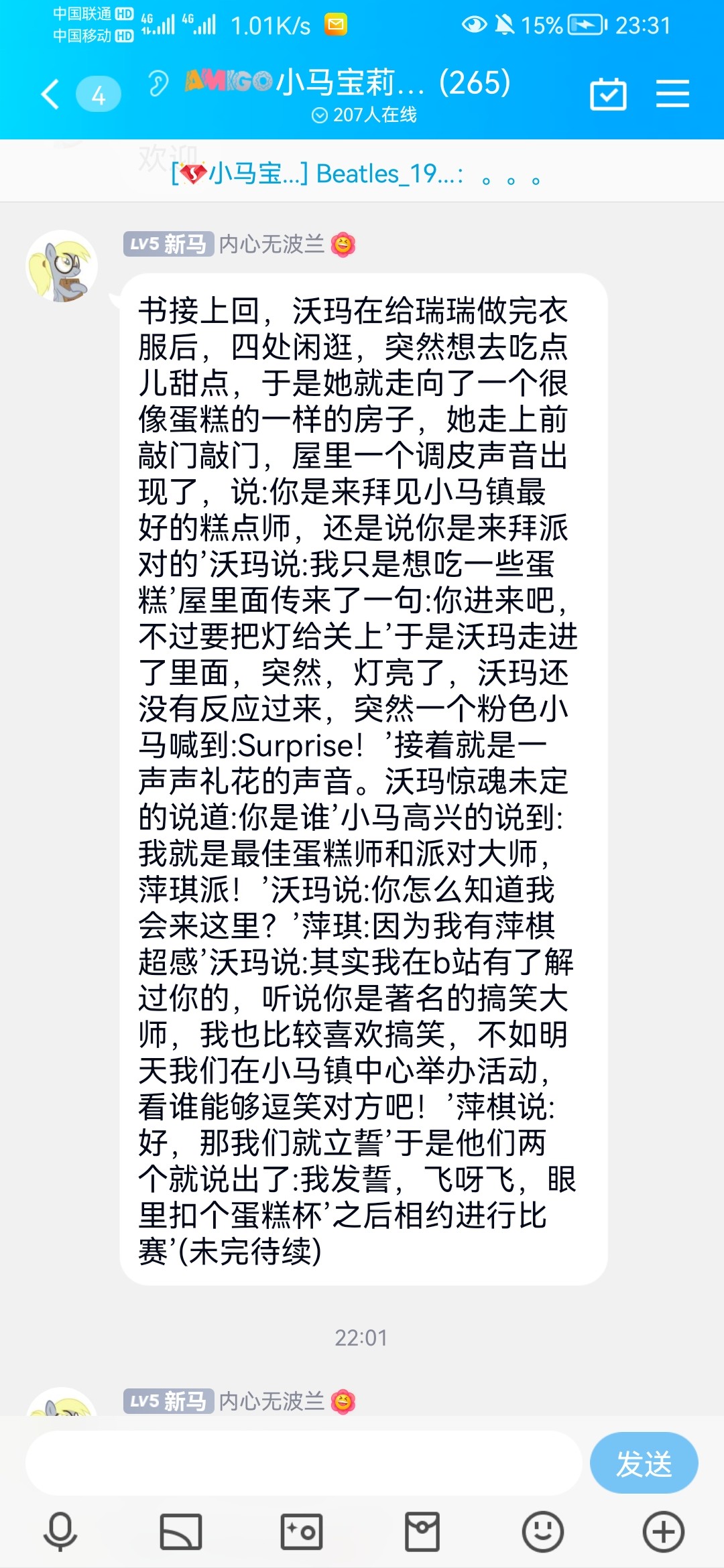 "嗨!朋友们!~……"(不对劲儿……)萍琪派的声音少了往常的活力,而且小马们也没有像往常一样亲切的回应她……