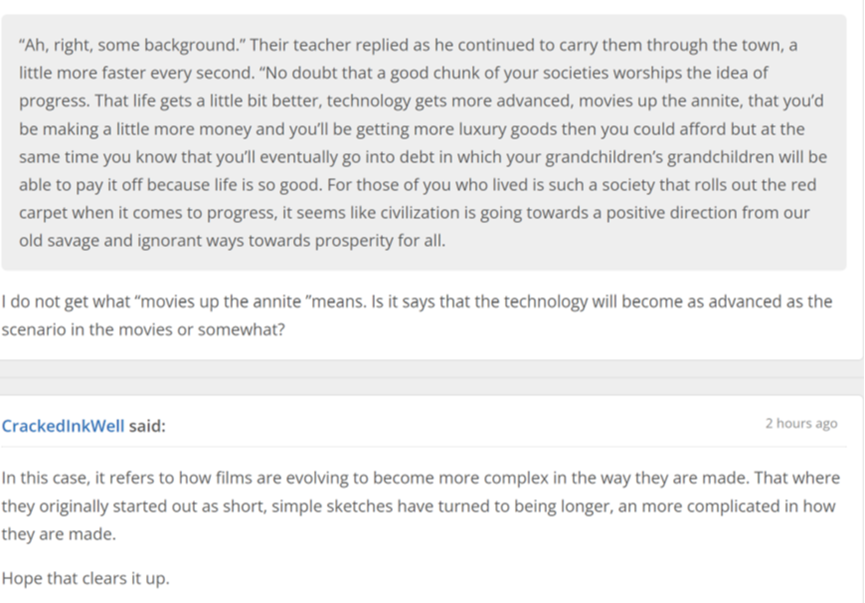 “他说这对于小马国而言是一种惩罚,或者(他那个时代)大革命前的法兰嘶。理性时代潮起潮落的那些年,王公贵族仍执掌着国家,他们比凡夫俗子有更大的话语权。当时到处是这种论证我们比所谓的‘蛮族’更好的文章,与此同时,我们自己的社会比斑马洲的部落、南露娜洋的岛屿、乃至是边远的北地还要荒唐不智。”