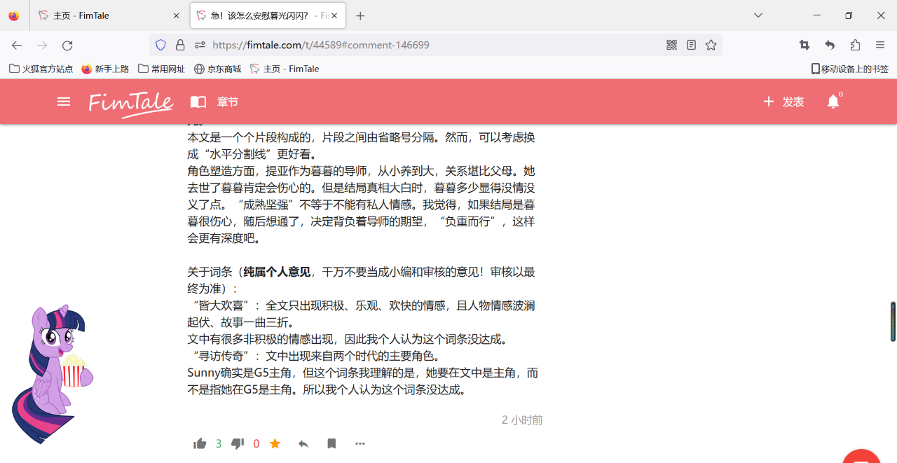 其实,作为一名云南人,早在这次冬活出来之前,我就想写一篇整活文,写的是小马吃野生菌中毒后发生的事情。那么故事主角写谁呢?我的第一直觉就是写暮暮,因为暮暮知书达理、理智成熟的马设,写她中毒后的一系列疯疯癫癫的幻觉会让作品颇为滑稽。想到这里,我连名字都取好了,就是现在这个《暮暮吃菌中毒了》。非常偏离我主体风格的一篇作品,生草小故事。总之,本文的诞生是由一个云南人对野生菌的喜爱、对小马的热情和冬活词条的碰撞下产生的火花。