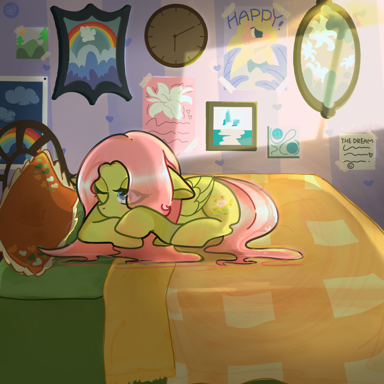 一如既往,她用她的蹄子轻柔地拍了拍闹钟,撇开她粉色的长发,然后睁开她淡蓝色的眼眸,展开蹄子伸了个懒腰。
