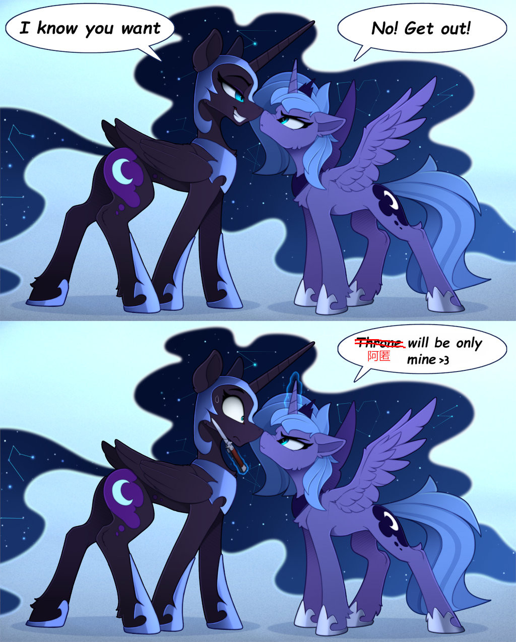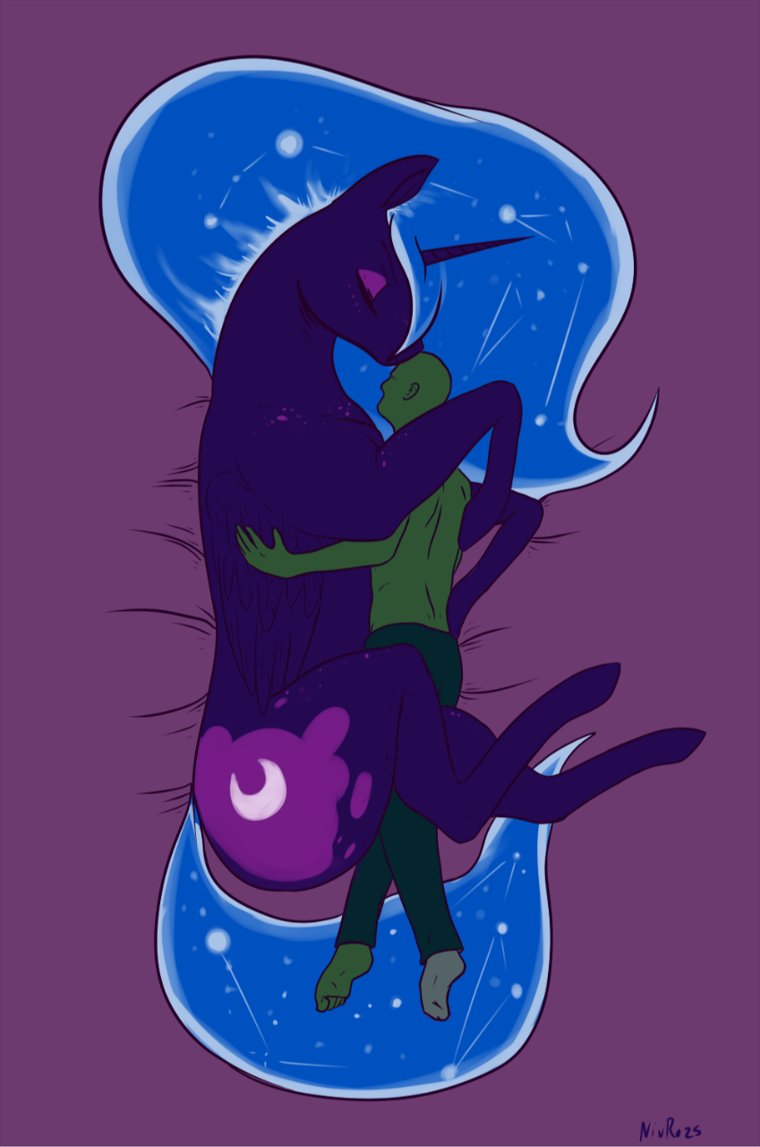 当阿匿看到这匹小雌驹开始变形时,他微微后退了一步。她的淡蓝色皮毛变得像午夜一样黑。她娇小的体型长得越来越大,直到变得和塞拉斯蒂娅一样高大。当她再次抬起头时,阿匿可以看到她眼睛里的竖瞳和嘴边伸出的长长獠牙,她的鬃毛变成了蓝色的薄雾。不管站在他面前的这匹小马是什么,它都不是露娜。他需要努力让她恢复正常的精神状态。