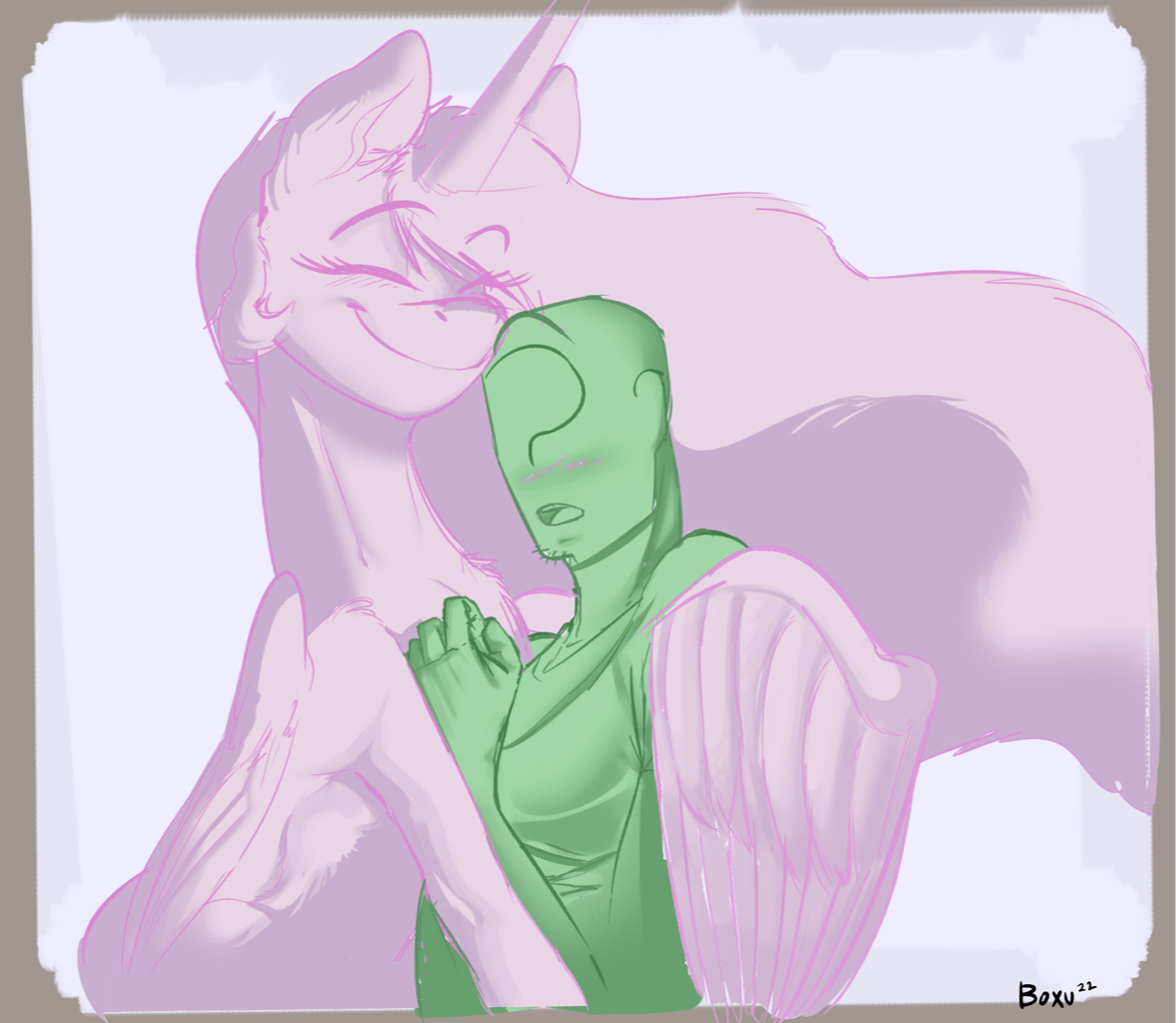 皇家姐妹俩都穿着盛装。不是她们的皇家饰物,也不是严肃正式的装束,而是他预期会看到,那个,其他小马穿的长裙。更不用说她们的鬃毛不是通常阿匿已经习惯看到的那种灵光闪烁的样子。不,他看到的是她们天生颜色的鬃毛,他已经很久没有见过了。然而,和其他小马不同的是,她们俩没有化妆,很奇怪的是阿匿更喜欢这样,好像化妆会毁了她们的相貌似的。