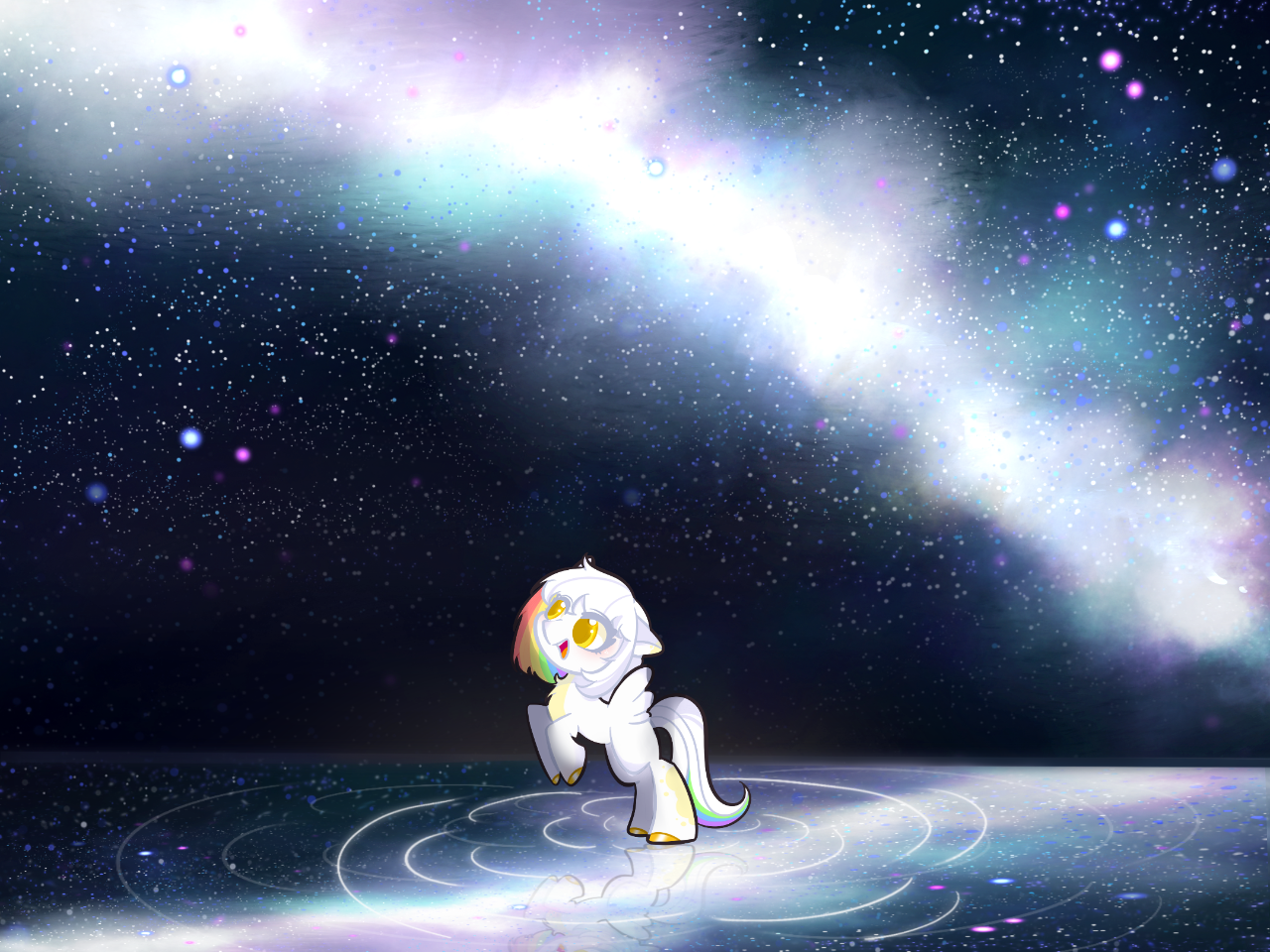 无比广阔而平静不动的湖面,一望无际,若不是因为没有海风与清咸,说不定还会令小马认为这里是哪处的海面。夜空,玉盘似的明月高悬,无数星辰被镶嵌在深蓝色的夜空中,也不知是谁的杰作。星星们就像沙子一样洒落,却又有点点规律,让充满想象力的小马们可以把它们连成种种美妙的图案。在天空的中央可以看见一条乳白色的丝带,就好像一条分割了夜空的小河一般,那便是银河——或者说一条乳白色的路,周围还佐有几朵散漫而壮丽的星云。看完了夜空,再低下头,你会惊奇的发现脚下竟是同样的景色,也是那数不尽的繁星却不知为何触蹄可及,闪闪发光。地平线已经俨然变成了一条对称轴,其上其下,完美而相同,那便是互相照应着的湖面与星空。
