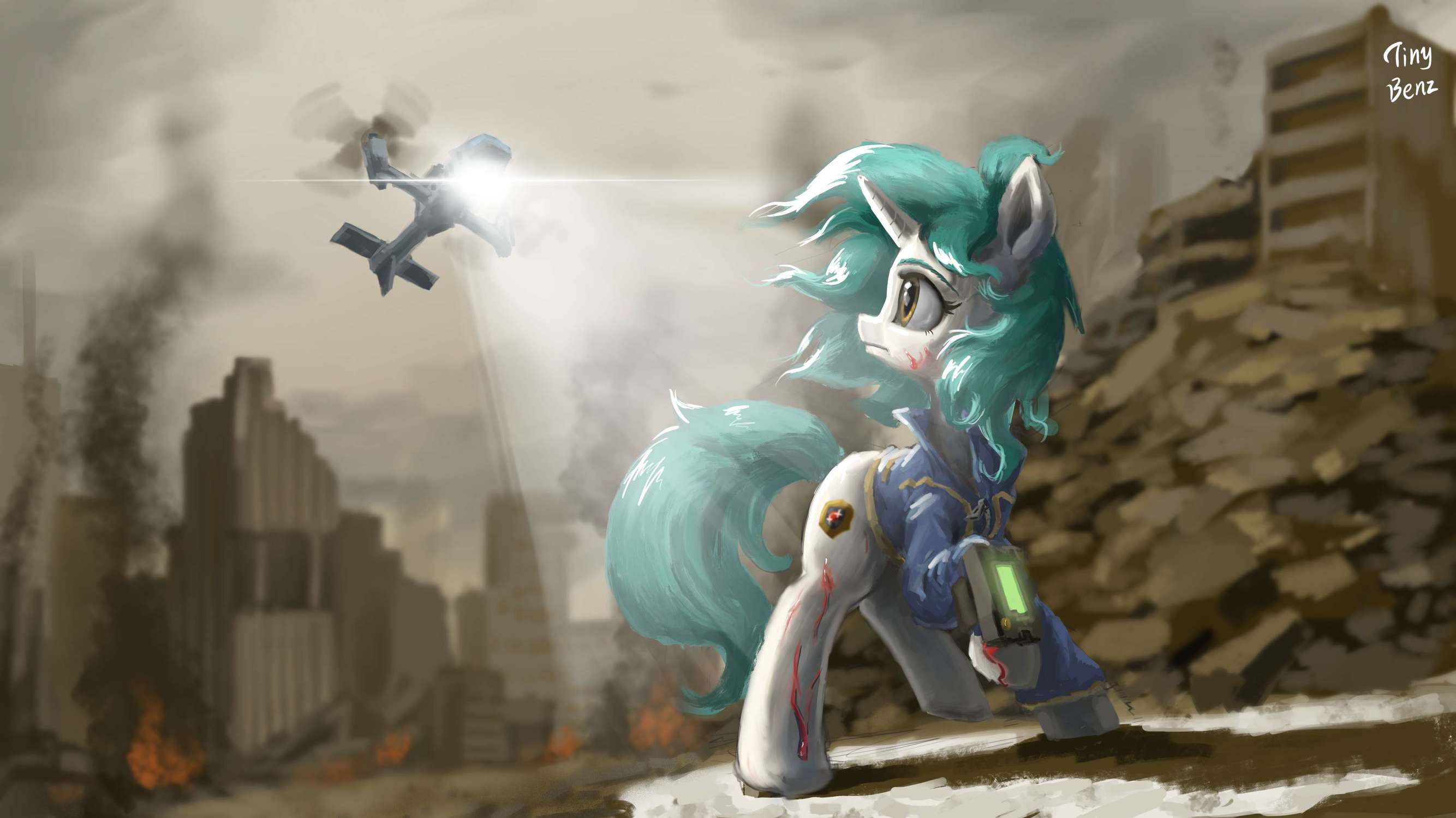 当暴风骤雨般的枪声停下来时,所有的敌马都已经被机炮撕扯成了碎片。我的眼前尽是灰蒙蒙一片,耳朵什么也听不见,只有模糊不清,令马抓狂的嗡嗡声。但我现在能看清楚那阵强大火力的来源了,我之前在《战时科技武器大全》上见过这东西。那是一架浑身都披满银灰色装甲的战机,战时科技的伟大遗物——垂直起降战鸟。这架战机的右翼三个苹果的图案,它左侧的铁门被猛地拉开,三匹全身被铁灰色装甲覆盖的小马从里面跳了下来。