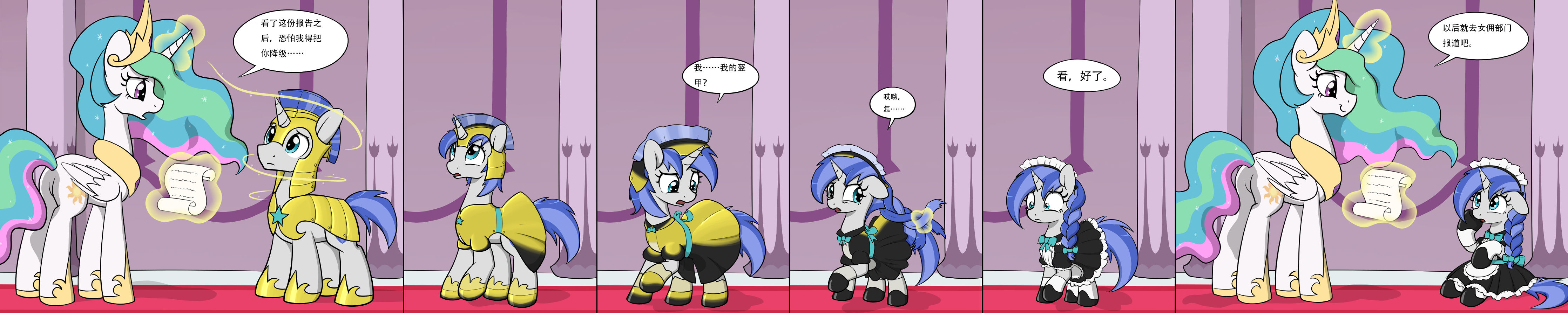 “看,好了,”公主欣赏着她的作品说。刚才站在她面前的公马现在变成了一个小而可爱的雌驹,并身着保洁员的黑色女仆装。