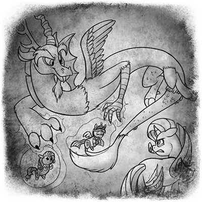 瑞瑞咽了一下,然后她想象了一下。暮光闪闪消失了,取而代之的是混沌恶魔,看着她….面无表情,目光如他的灵魂一般黑暗。