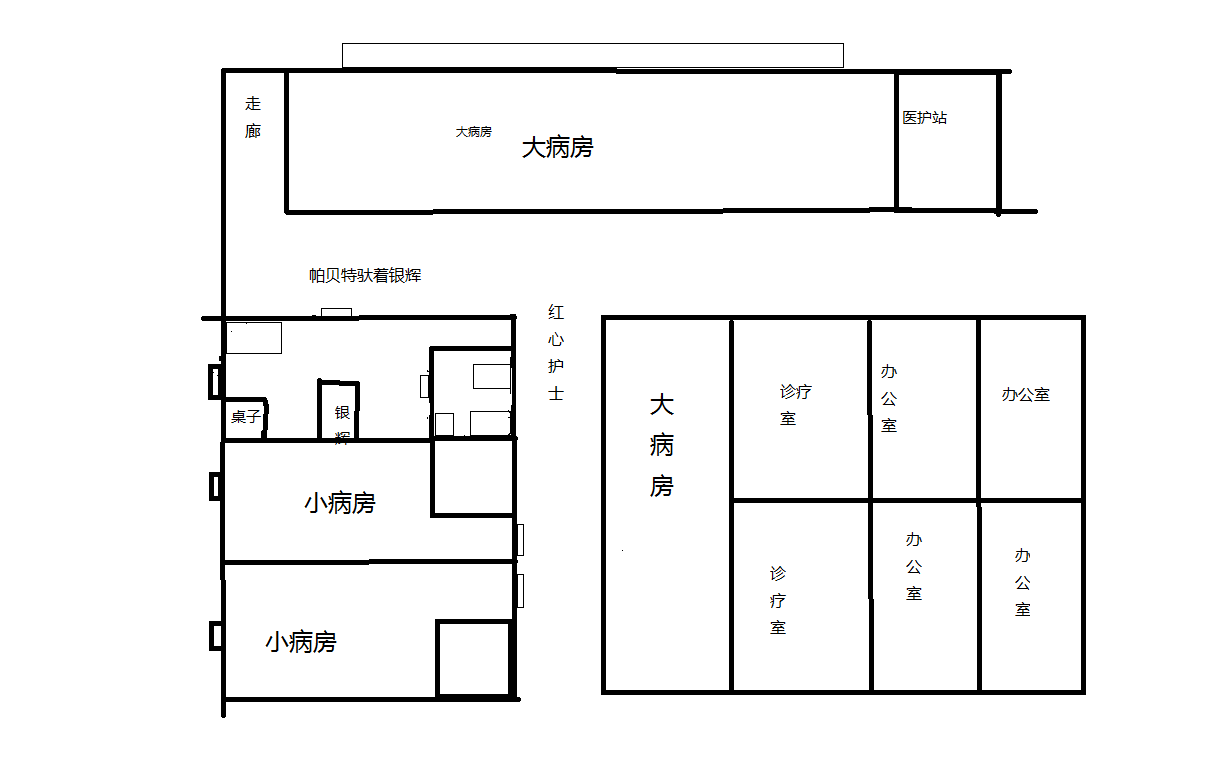 打开门,外边就是走廊,走廊成T字型,我的房间就在T字型内边的拐角,帕贝特告诉我出门往右走,一直到楼道道尽头就是医生的办公室,仔细看来这个医院挺大的。
