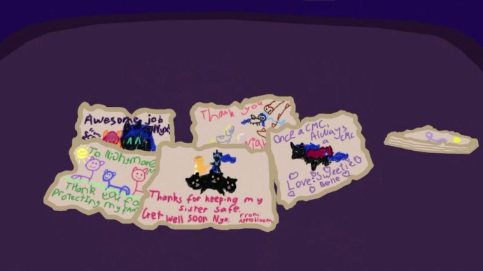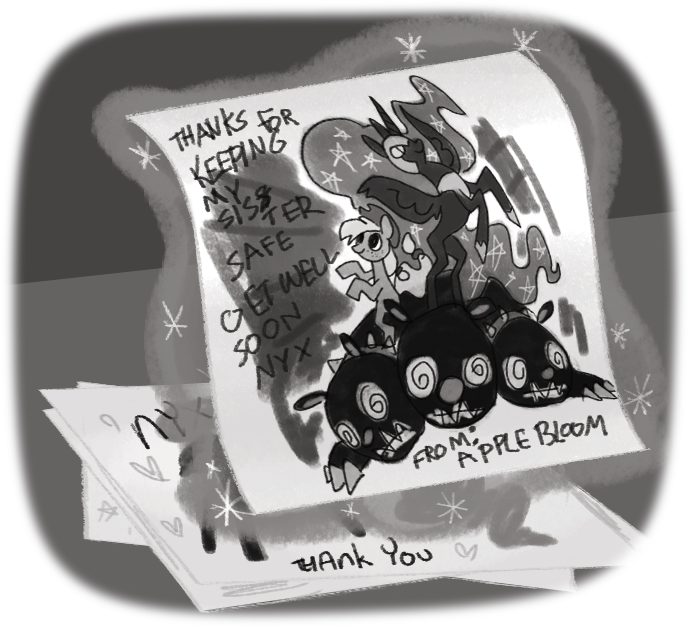 于是梦魇之月被安置在了暮暮正在走近的地方。她没有去唤醒梦魇之月,她知道她需要让她休息。不过,暮暮依然希望靠得近一些,她希望当梦魇之月最后睁开她的眼睛时,她会在那里。
