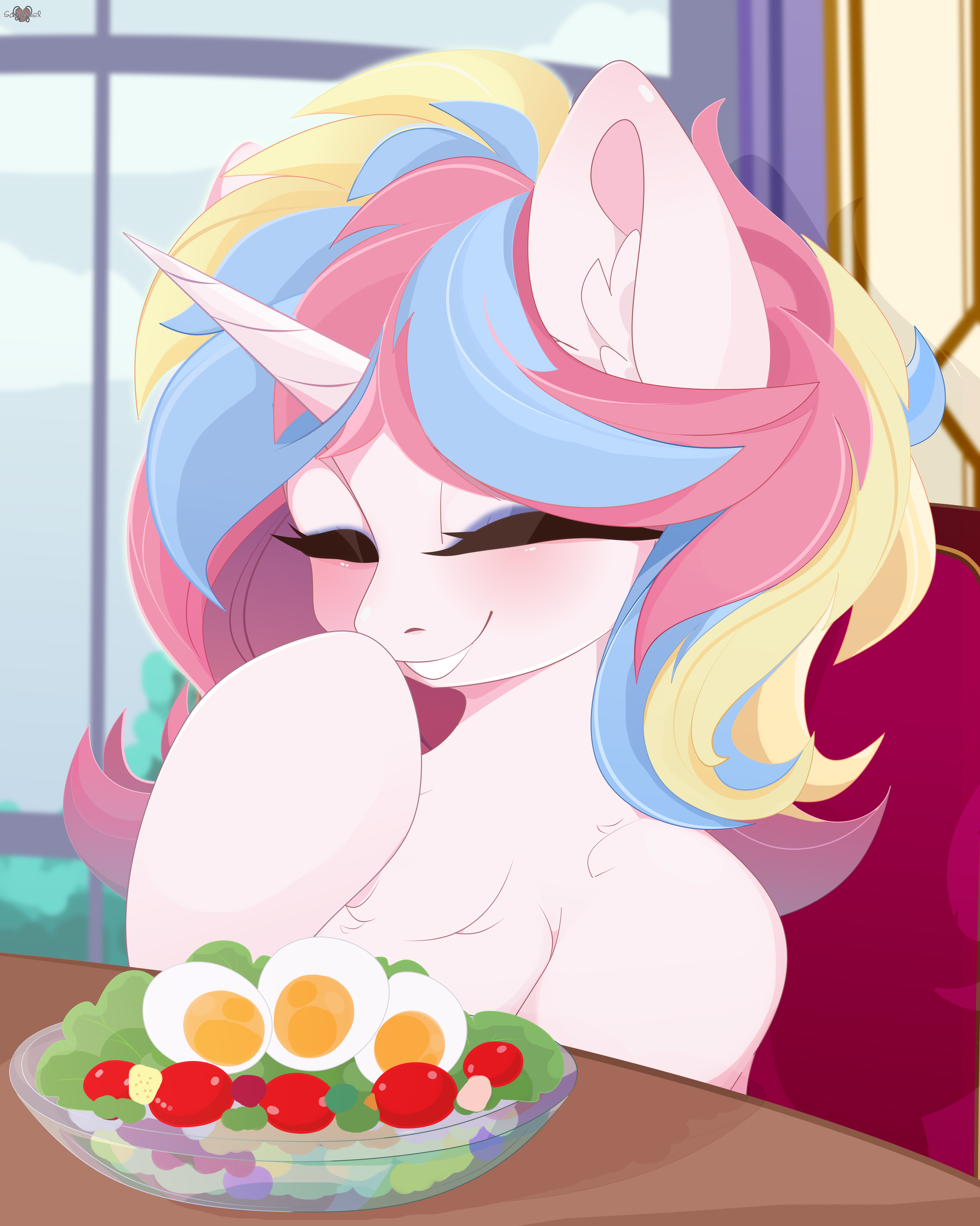 我们叫来服务员点完餐之后,银河闪闪忽然站起身,说是要去卫生间洗个蹄。出于某种雌驹所特有的习惯,樱樱也说要跟着银河闪闪一起去,于是这里便只剩下了我们两个雄驹。